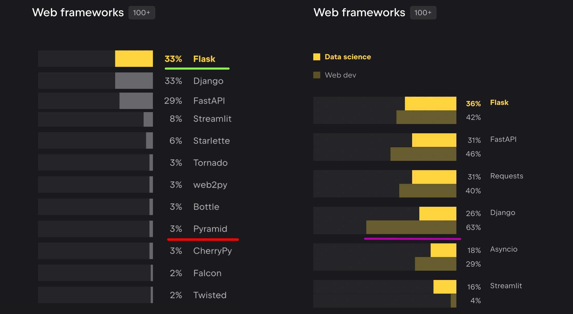 Actually no. Flask is the most popular across all disciplines. But see the purple line. Django is used 1.5x as often as Flask for web developers. Django is really popular amongst people who consider themselves web devs not just Python people who touch a web framework now and then. I also highlighted Pyramid for contrast.