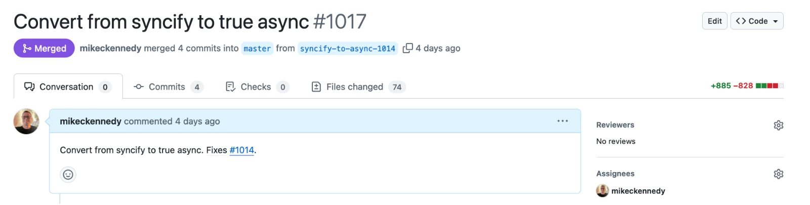 Even though it was tricky, it took one day. And this time only around 1,700 lines of code changed. That’s still a lot, and it’s the tricky async type of code. Another interesting observation is that even though it’s fewer lines of code changed, it’s almost double the number of files changed. Because once you start down the async path, this pattern goes up and down vertically through the whole stack.