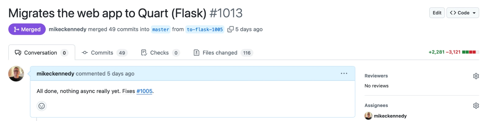 The conversion to Quart went really well and I was inspired to keep going and see what benefits we could get from moving from synchronous to asynchronous code. So I created another new branch in GitHub, a new issue, and started coding again in the same style, starting with one blueprint and then another and then another. I got each of them working as a group and then moved to the next.