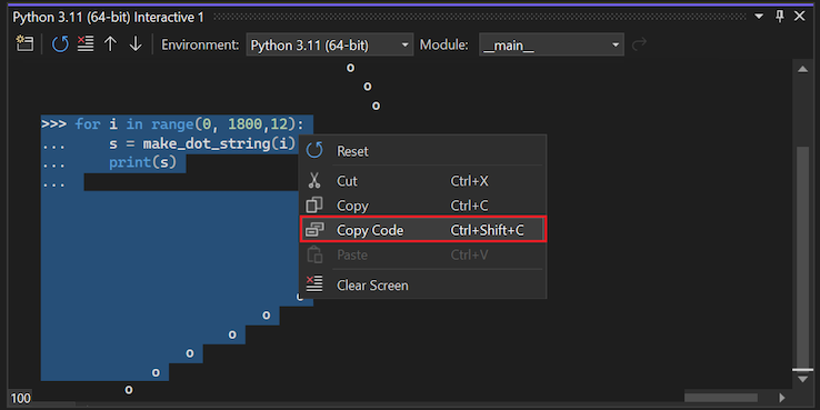 for i in range(0, 1800, 12): s = make_dot_string(i) print(s)To copy the exact contents of the Interactive Window, including prompts and any program output, use the standard Copy command.